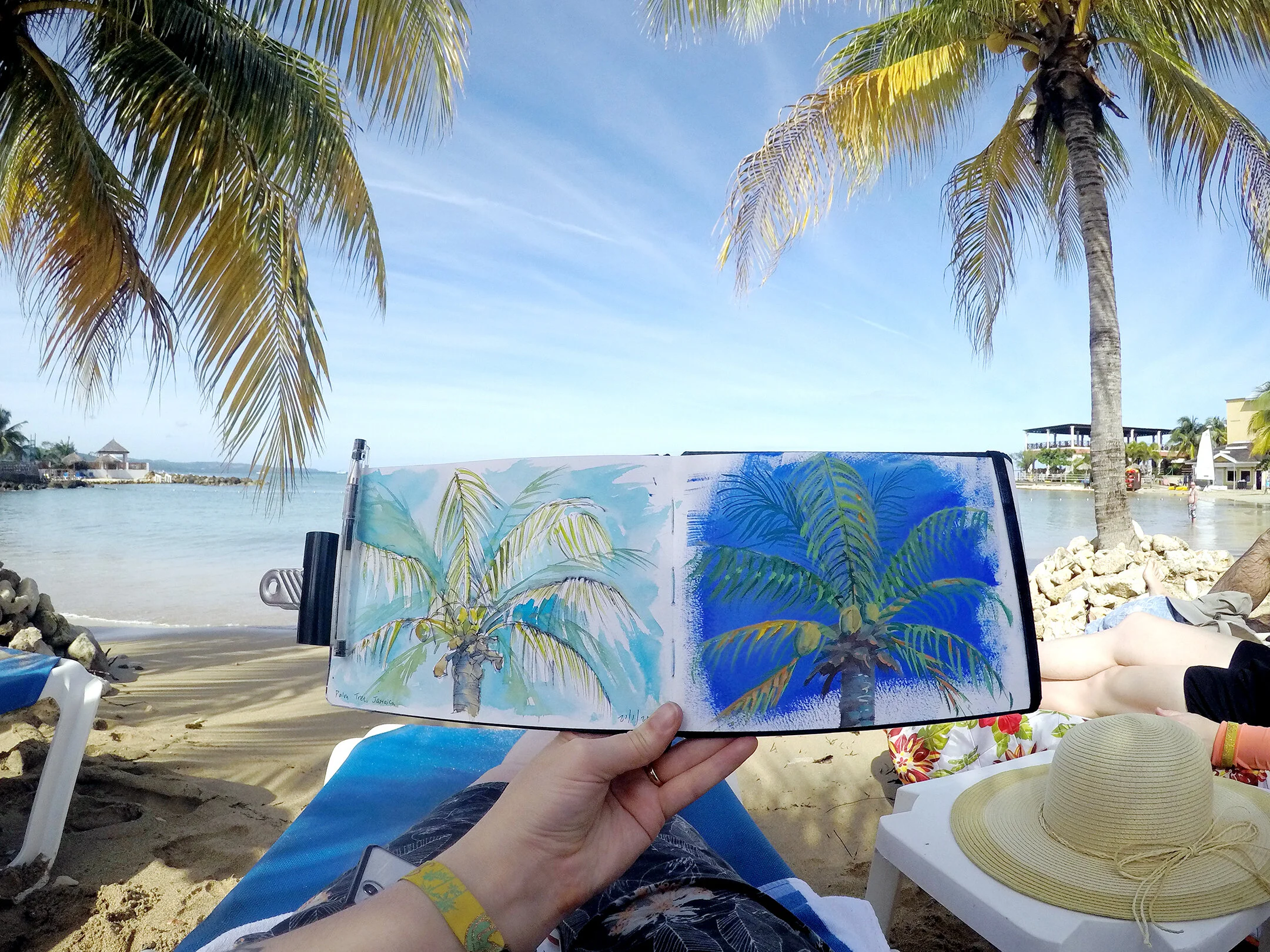 The next day I snuck in a couple palm tree sketches because I was mesmerized by them while I laid on the beach. I remembered to setup my GoPro on my beach chair, because I promised I’d take some painting video during the trip.